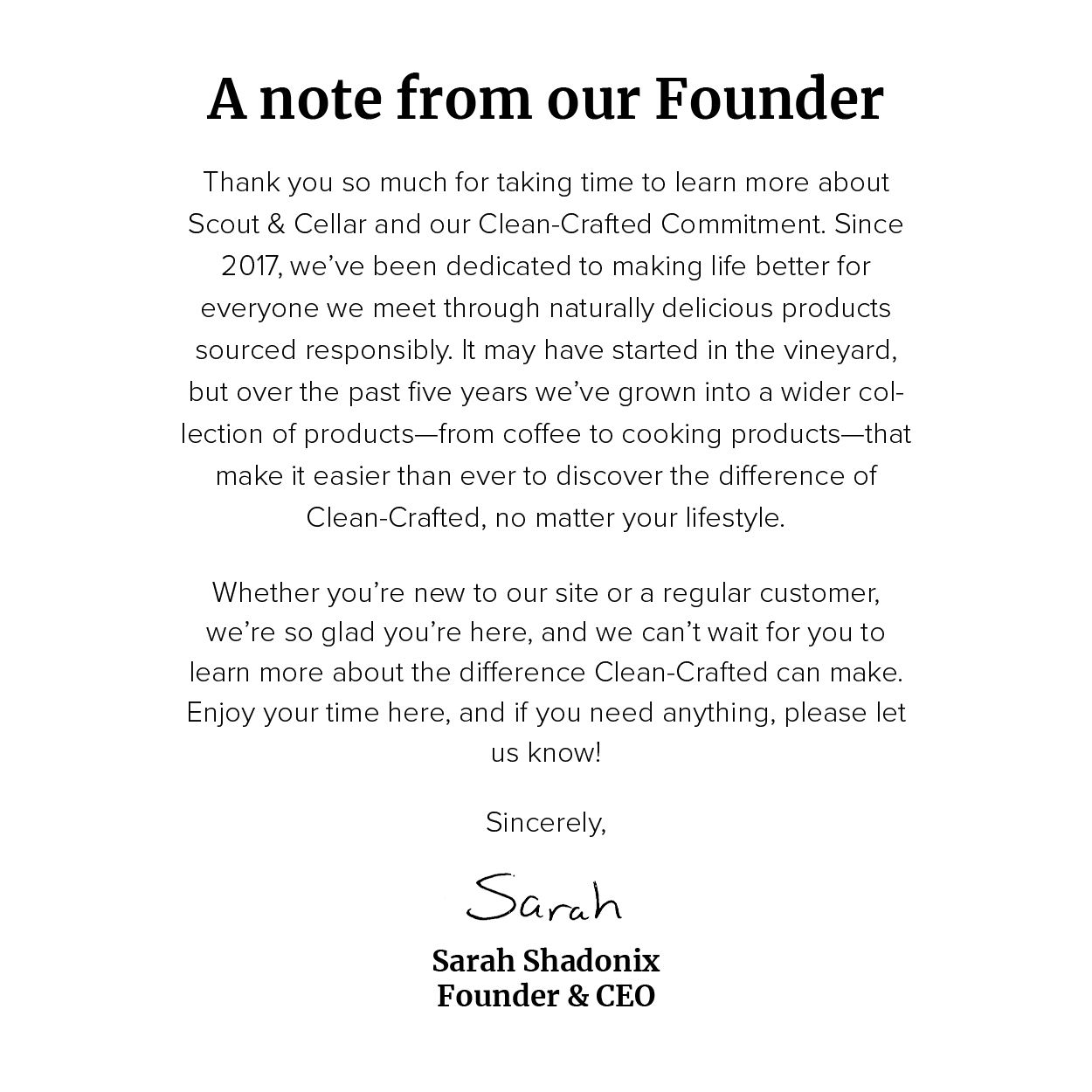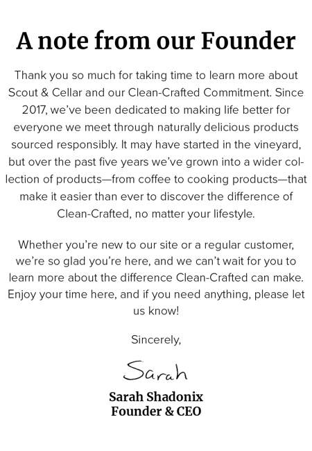 Everything that leaves our doors is created to taste great, to do better for our planet, and to improve how we live. Today, Scout & Cellar is the exclusive home to Clean-Crafted across several categories, from coffee, to cooking products, to wine and ready-to-drink beverages, and more.